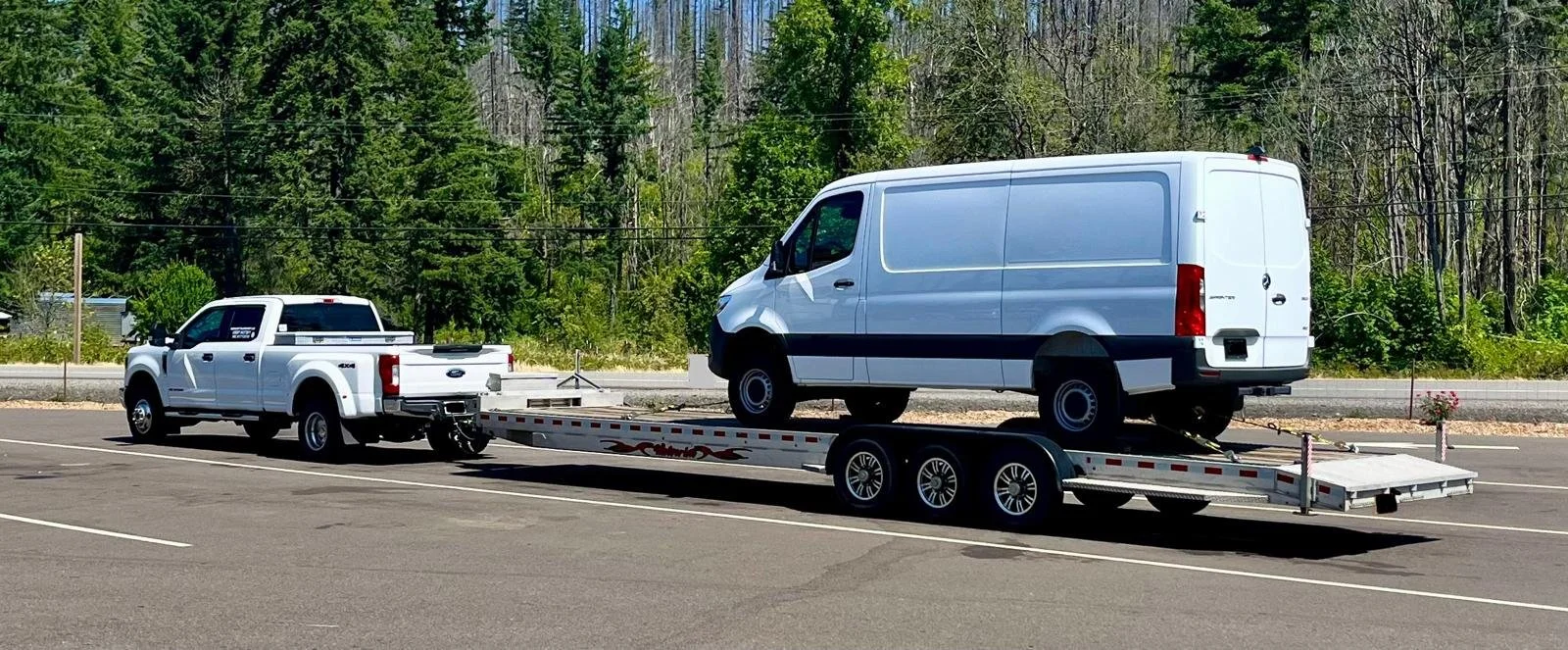 Our Ford F-350 Dually handles both our open and enclosed trailers with ease and is equipped for fifth-wheel, gooseneck, and pintle hitch towing—offering up to 30,000 pounds of capacity. We also assist with maneuvering RVs, trailers, and other large vehicles when precise handling is needed. -